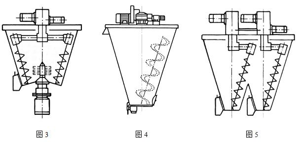 7、如圖5所示兩錐體結(jié)合成一體,為雙錐雙螺旋結(jié)構(gòu)。此結(jié)構(gòu)可在保持體積不變的同時,大大降低錐體的高度,適合于設備的大型化及大生產(chǎn)。