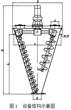 DSH型混合機結(jié)構(gòu)如圖1。主要由錐體、帶電機減速機、傳動機構(gòu)、螺旋及出料閥等部件組成。在錐體內(nèi)安裝兩根螺旋,螺旋采用非對稱結(jié)構(gòu)。長螺旋沿錐壁安裝,短螺旋靠近錐體中心部位安裝,且螺旋直徑比長螺旋大。使用時,兩螺旋作自轉(zhuǎn)的同時又沿錐壁作公轉(zhuǎn),即行星運動。該機使用特特征: